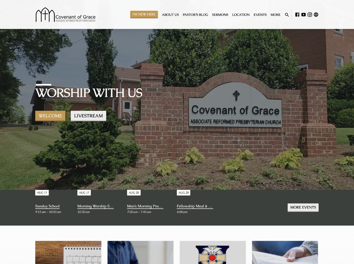 We are honored to announce the launch of the new website of Covenant of Grace ARP, a vibrant church in Winston-Salem, NC. As a loving church family, Covenant of Grace is dedicated to equipping people to know God and His Word through serious yet joyful, Christ-centered worship and service. To help them step confidently into a new season of ministry, our team has executed a complete website redesign. This project was a unique opportunity to join forces with the staff of Covenant of Grace ARP to built a new site along with them that beautifully reflects their welcoming community and deep commitment to their faith.